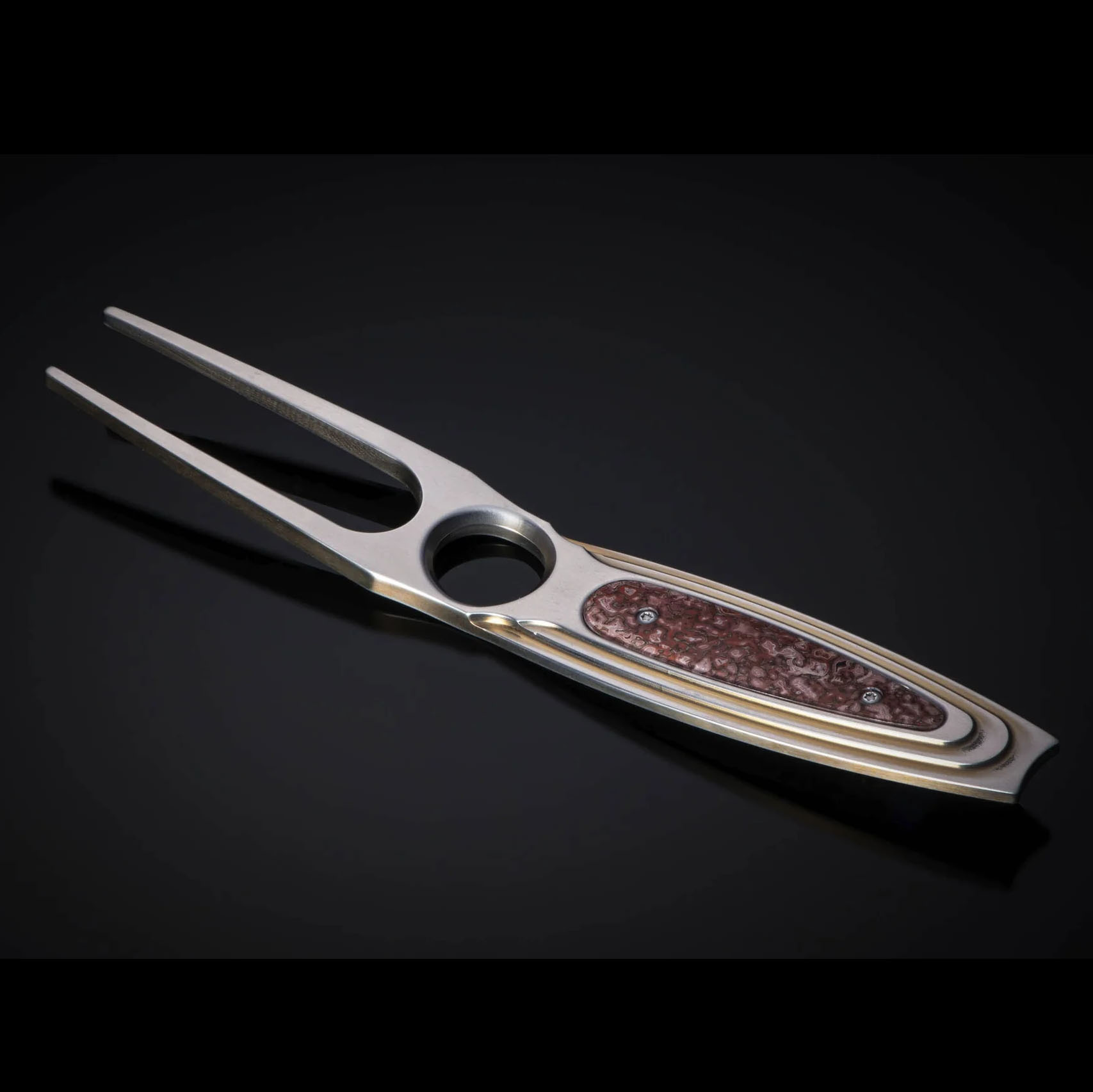 提升你的球技!或者至少提升你在高尔夫球场上的格调,这款来自威廉·亨利 (William Henry) 的精美草皮修复器将助你一臂之力。“圣安德鲁斯”草皮修复器采用航空级钛合金坯料精密加工而成,经阳极氧化处理呈现迷人的金色,并镶嵌有距今一亿年的恐龙化石(迷惑龙)。超大的倒角孔为你的拇指提供了绝佳的支撑点,方便使用时更好地控制(而且看起来也很酷)。这款草皮修复器经久耐用,可使用数百年。