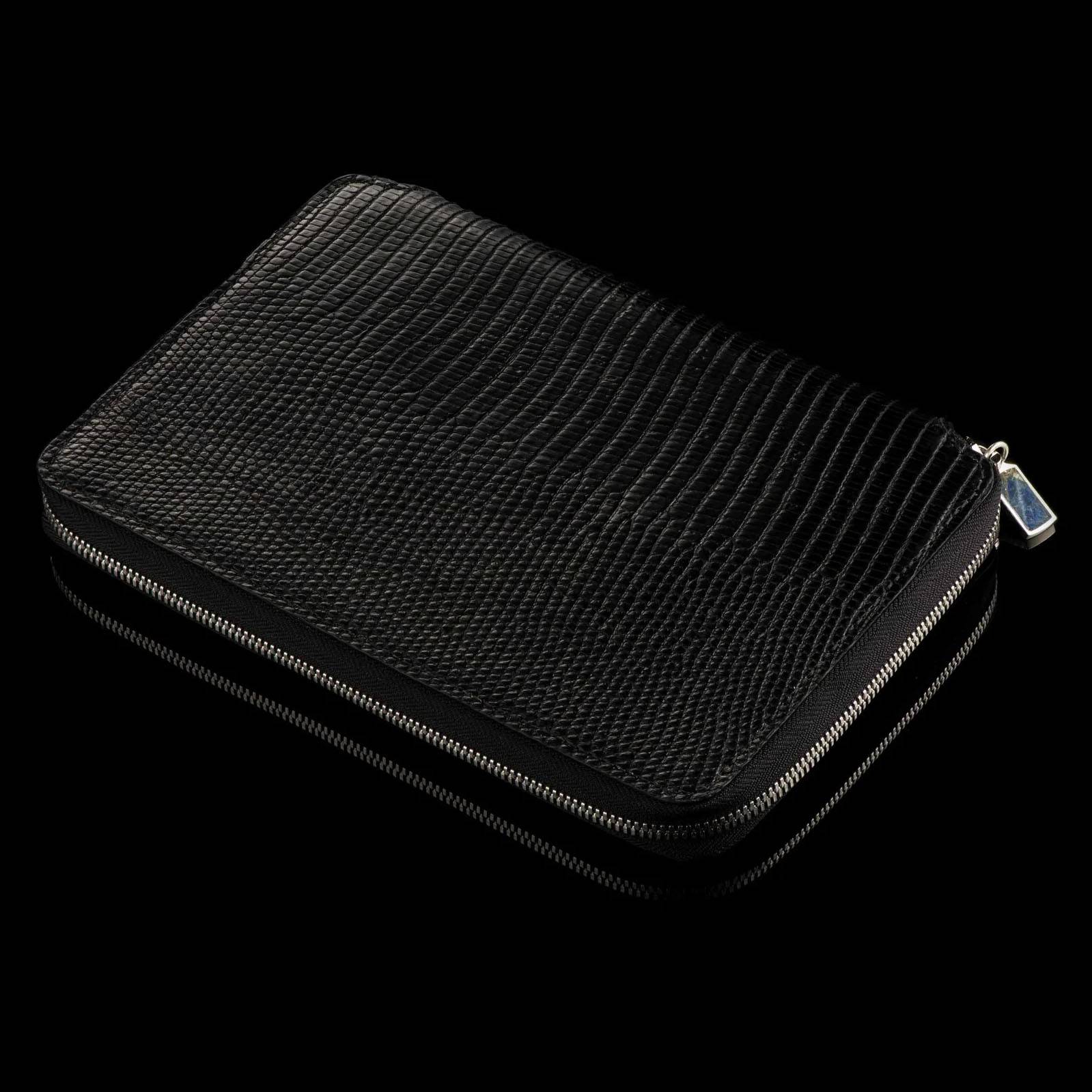 蒙特卡洛皮革由佛罗里达州著名的Leatherwks皮革厂精心制作。Leatherwks是一家拥有四代传承的家族企业,致力于在精美的全粒面皮革上打造精湛的工艺。黑色蜥蜴皮制品采用德国理查德·霍夫曼制革厂的优质皮革精心制作而成,内外均采用精美的全粒面皮革,做工精良。