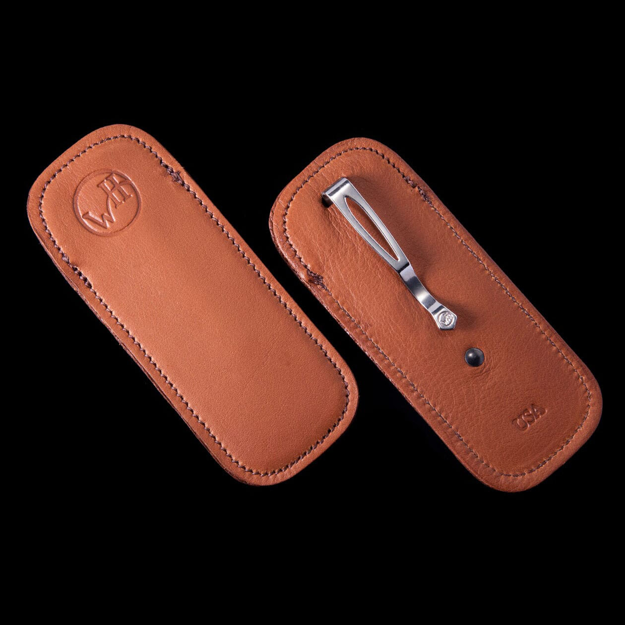 这款皮革刀套©专为您的威廉·亨利刀具设计。内外均采用柔软的高级皮革,可妥善保护您的威廉·亨利刀具,即使放在口袋中也安全无虞。刀套正面和一体式不锈钢口袋夹上均压印有我们的“WH”标志。
